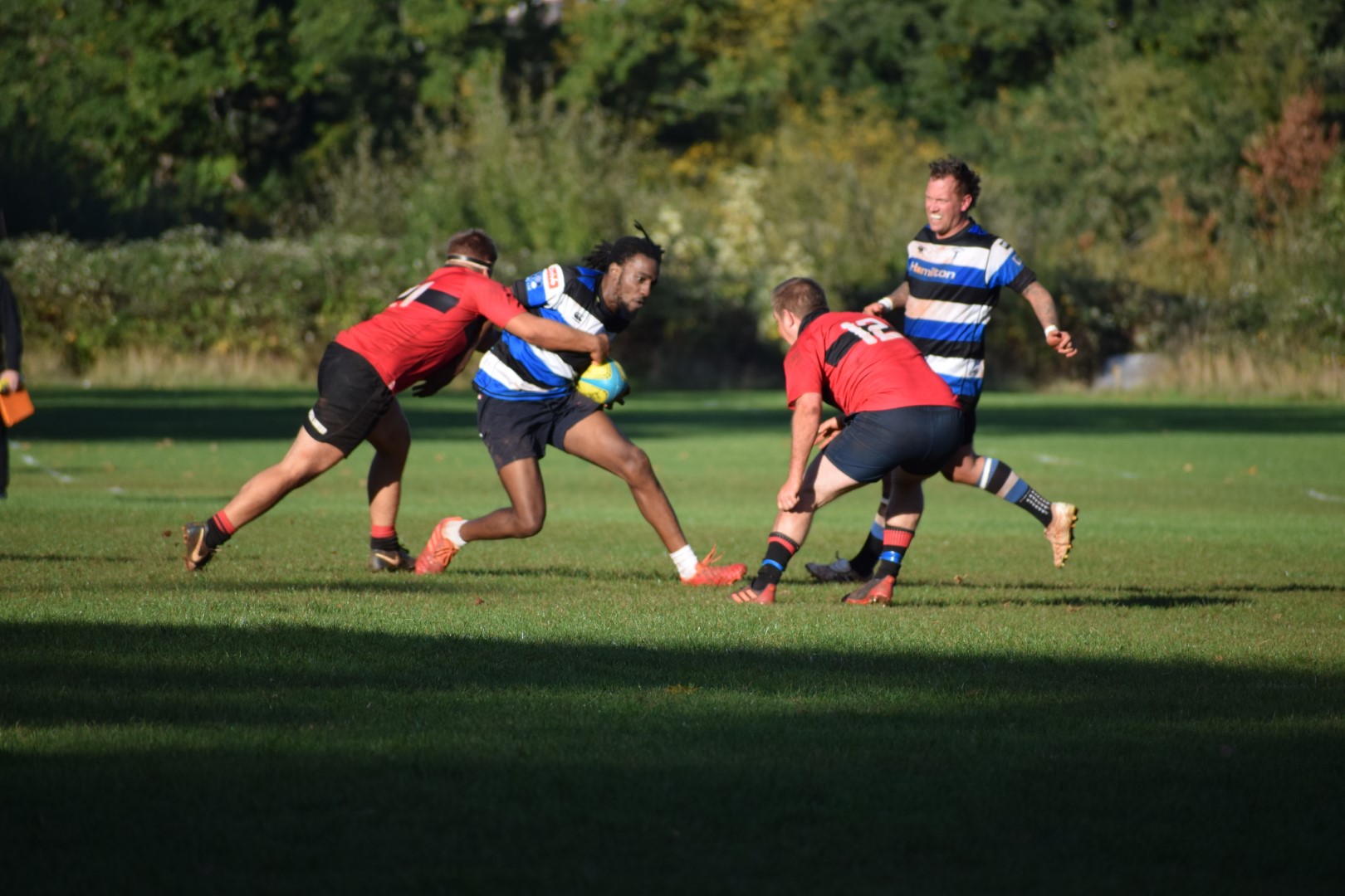 The match started well for Quins with Ryan North dotting down for his 1st try of the season. Lee Pearn burst through the midfield and his offload to Ryan allowed him to run down the wing to get the try! Gordano then pulled one back and got the conversion giving them the lead, shortly after Quins saw Kelvin Hawkes sent to the bin for a deliberate knock on just outside the 22. Following successive penalties, Gordano extend their lead. Still with only 14 men on the pitch the lads got the ball through the hands quickly to Ryan North who, once again, crossed the whitewash with Chris Page converting from out wide to level the match. Daniel Pearce was then sent to the bin for Quins. All square at half time 12-12.