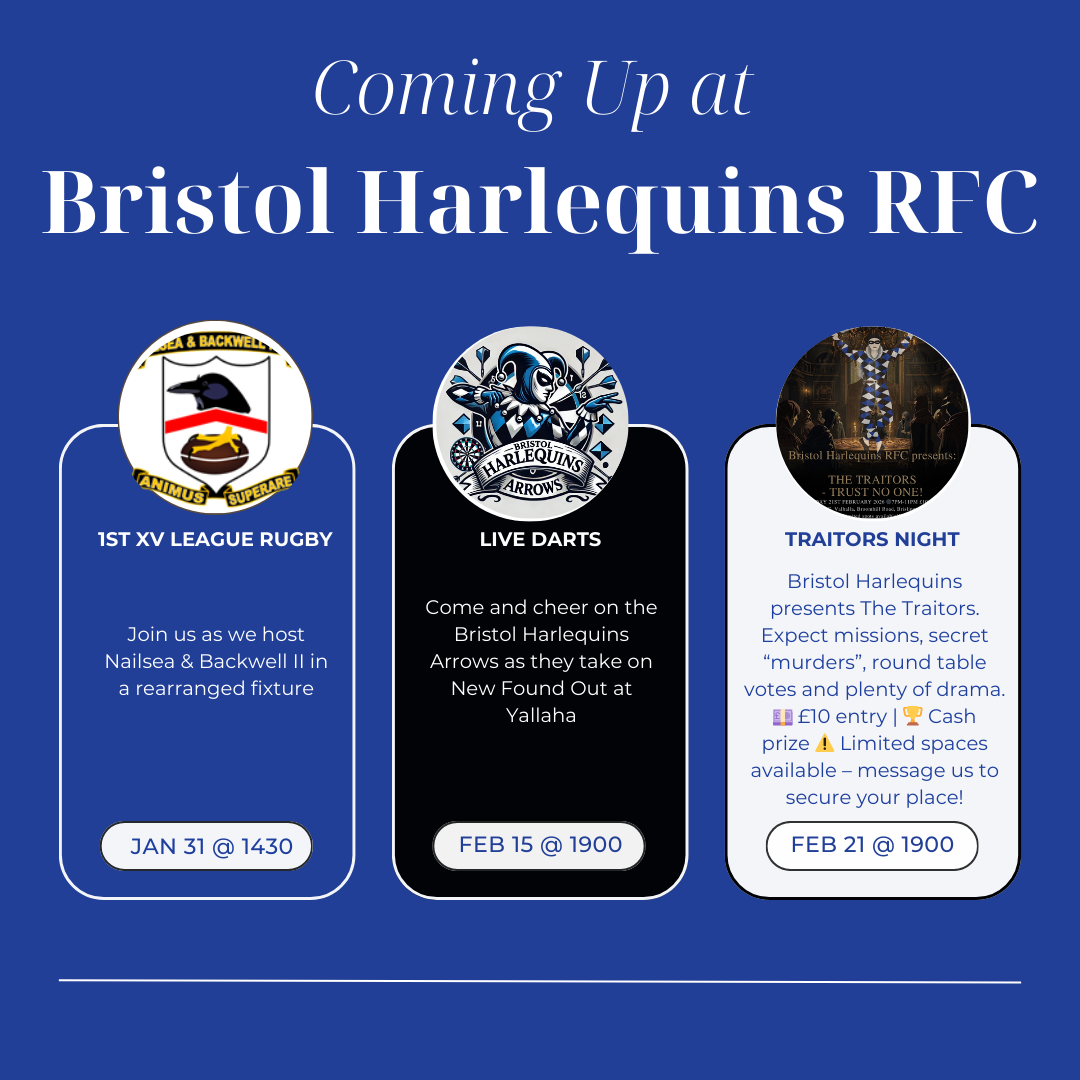 Rounding off a packed calendar, Quins will be hosting a Traitors Night on Saturday 21st February. The evening will feature missions, secret “murders”, round table votes and plenty of twists and drama throughout. Entry is £10, with a cash prize on offer, and spaces are limited — supporters are encouraged to message the club early to secure their place.