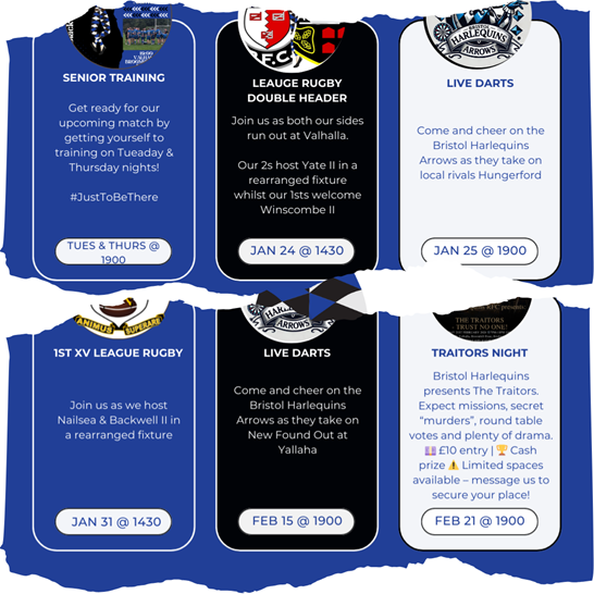 With rugby, darts and social events all coming up, there’s something for everyone at Quins over the next few weeks. We look forward to welcoming players, supporters and friends down to Valhalla soon.