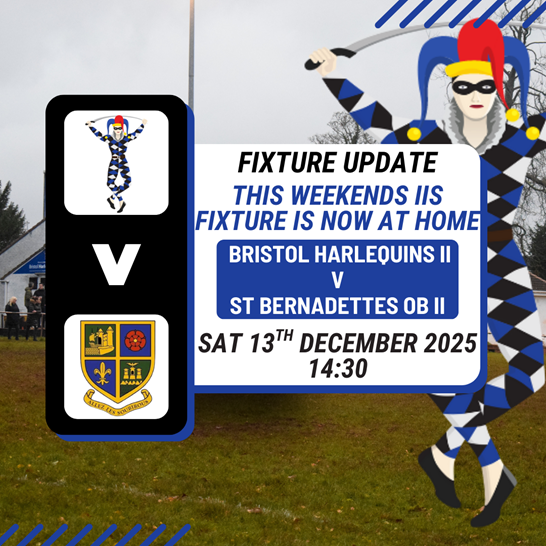 Bristol Harlequins RFC can confirm a change to this weekend’s fixtures following a pitch inspection at Fulford Road, the new home of St Bernadette’s Old Boys.