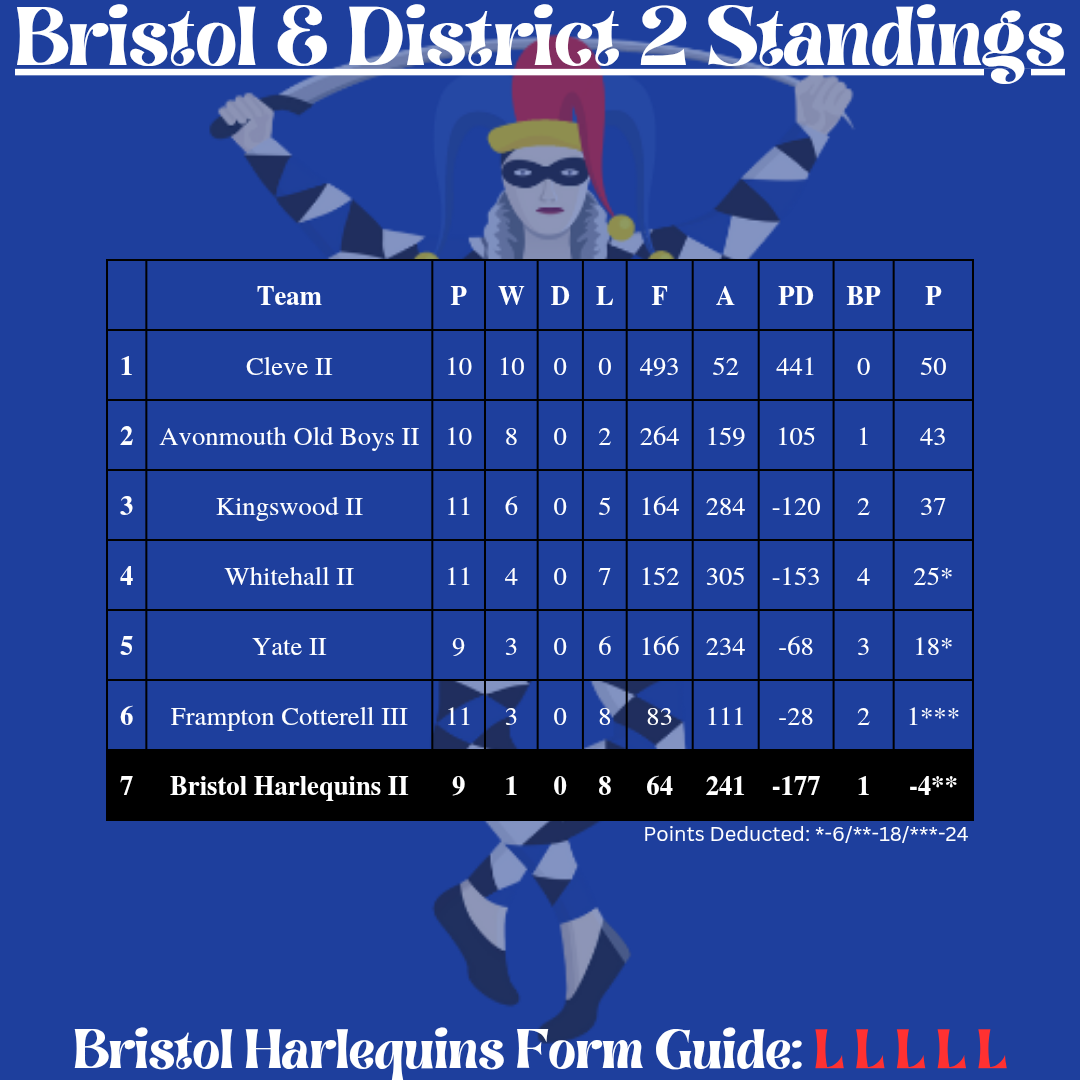 A reshuffle in the Bristol & District 2 League has seen Quins’ 2nd XV drop to 7th place following the removal of Old Redcliffians IV from the competition. However, with games in hand, there’s still an opportunity to climb the table and finish the season strong.