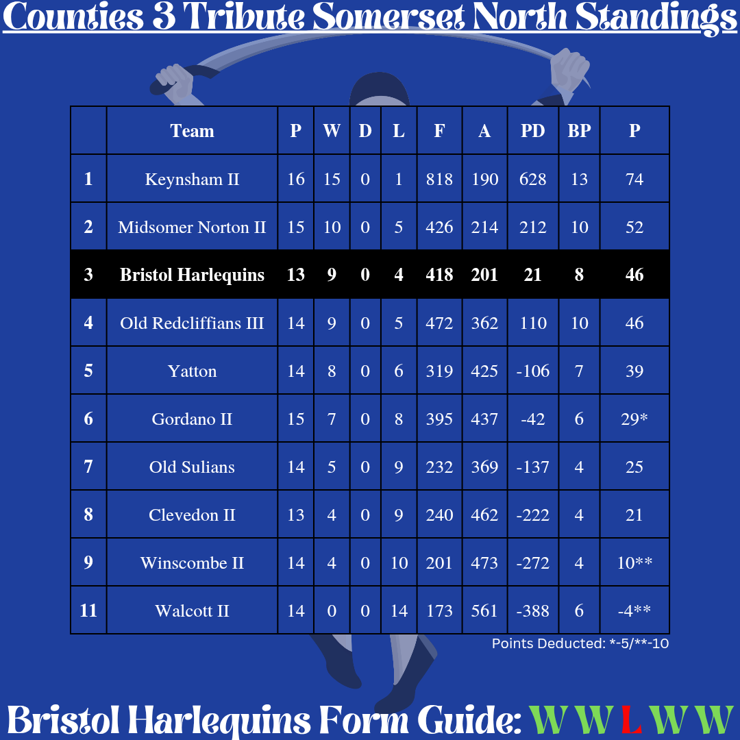 Over in the Counties 3 Tribute Somerset North League, a huge congratulations to Keynsham II, who have now secured the league title. Meanwhile, Quins remain in 3rd place, but the battle for 2nd spot is heating up. Midsomer Norton II now hold 2nd place, sitting 6 points ahead, but with two games in hand, Quins still have the chance to close the gap and push for a strong finish.