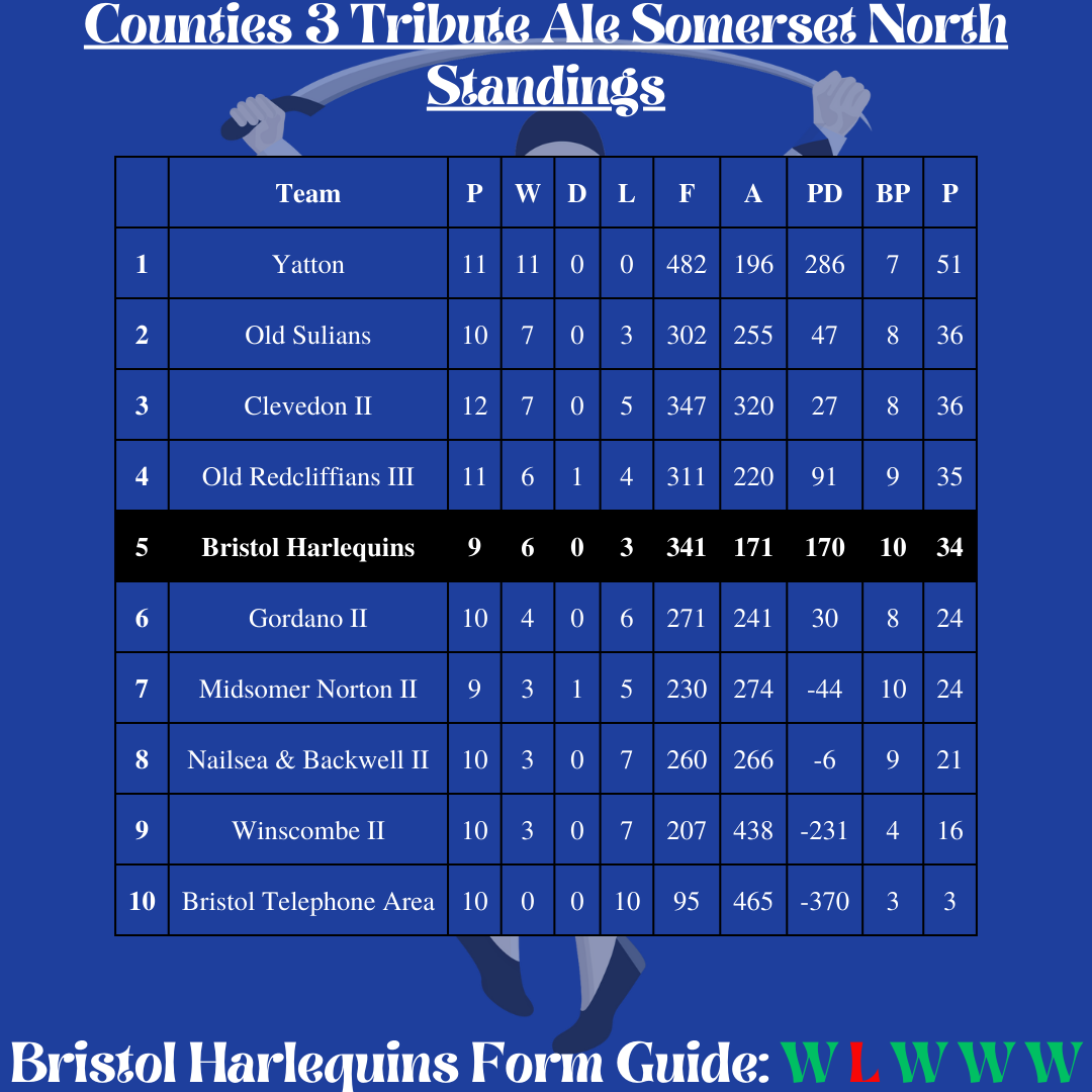 A weekend dominated by heavy rainfall saw only minimal fixtures take place across the leagues, resulting in no change to Bristol Harlequins’ positions for either senior side. While frustrating from a playing perspective, the wider picture remains a positive one for Quins, with both squads well placed and holding significant games in hand as the season develops.