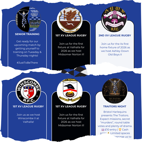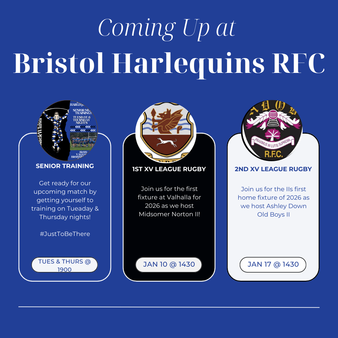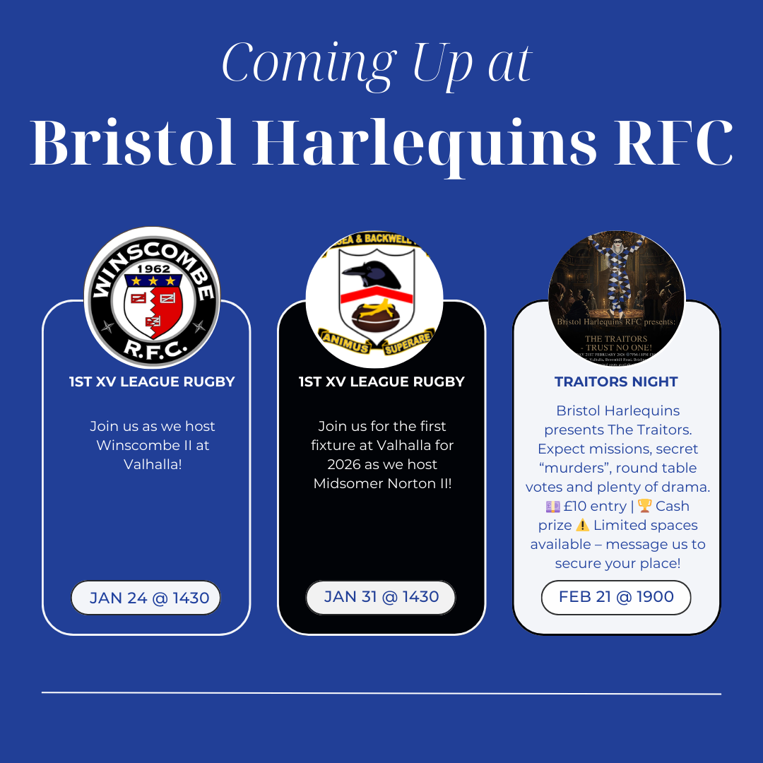 There’s plenty to look forward to at Bristol Harlequins RFC as we head into the heart of the season, with league rugby, training nights and a major social event all lined up at Valhalla.